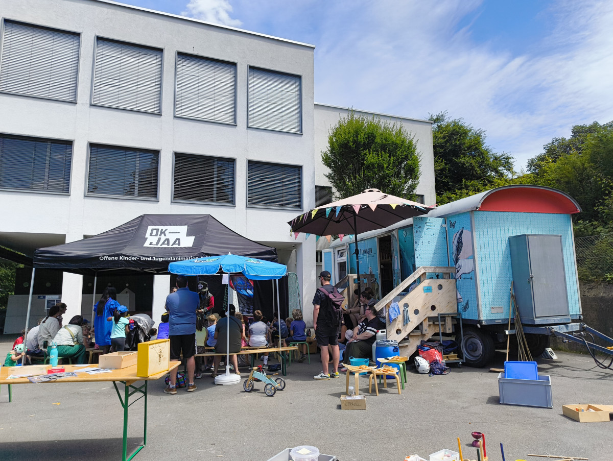 In der ersten Sommerferienwoche wurde der Schulhausplatz Adligenswil durch das Ferienprojekt „Karawagen“ der OK-JAA zum kreativen Treffpunkt für Kinder, Familien und die Dorfgemeinschaft. Der Karawagen der Albert-Koechlin-Stiftung diente als offene Bühne, Werkstatt und Lernraum – generationenverbindend und für alle zugänglich.